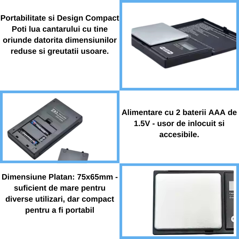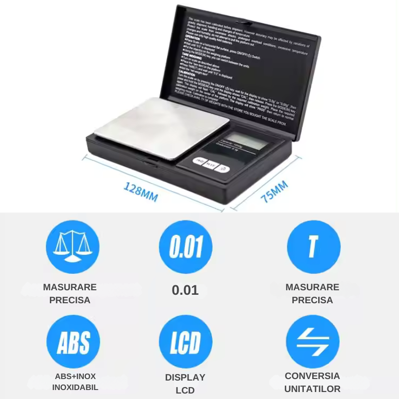 - Precizie Ridicata: Cu o acuratete de 0.01g, vei avea incredere in fiecare masuratoare.