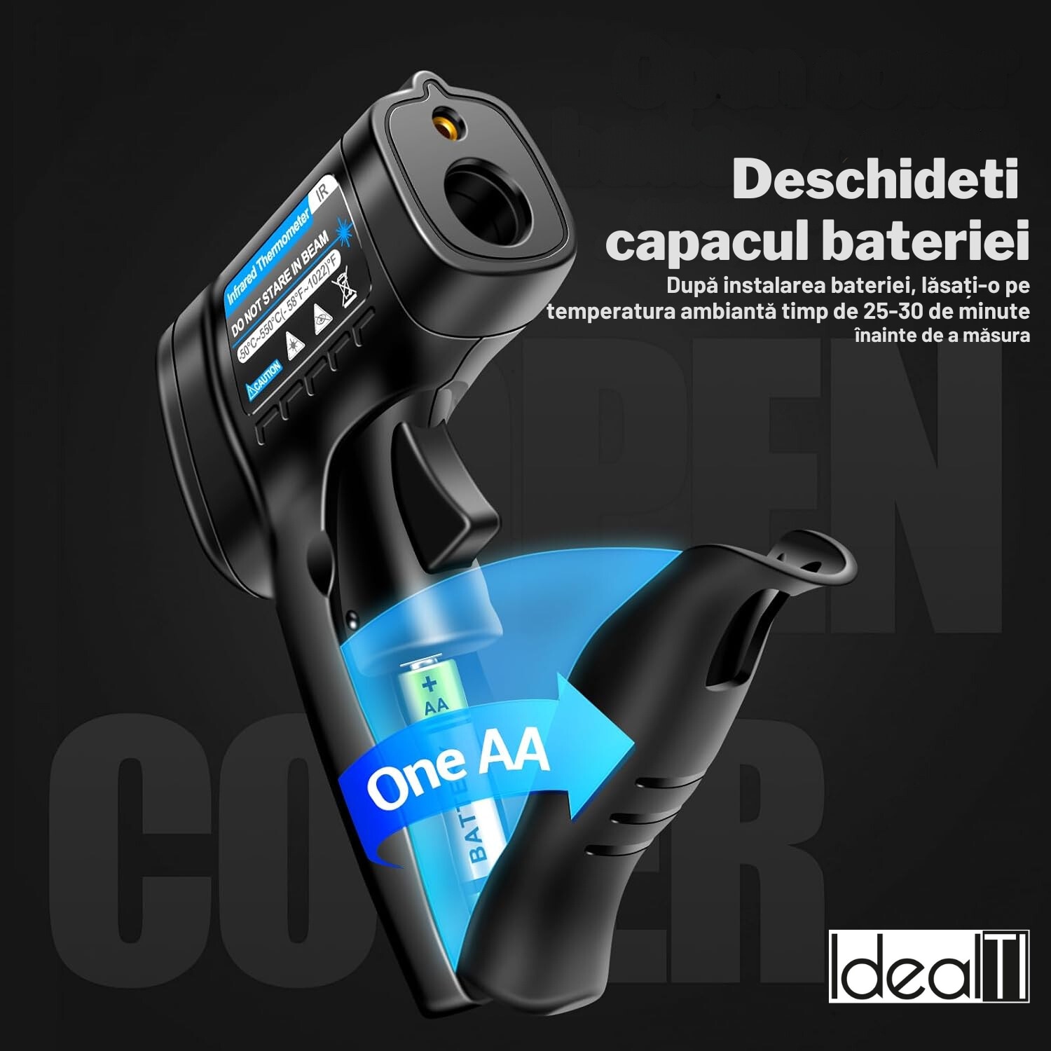 Termometru Portabil cu Laser Infrarosu – Fara Contact IdealTI®, Inalta Precizie, Ecran Color VA, Interval de Masurare de la -50℃ la 550℃, Distanta de Masurare 12:1, Unghi Operare 45°-60°, Timp Masurare 0, 5 Secunde, Negru