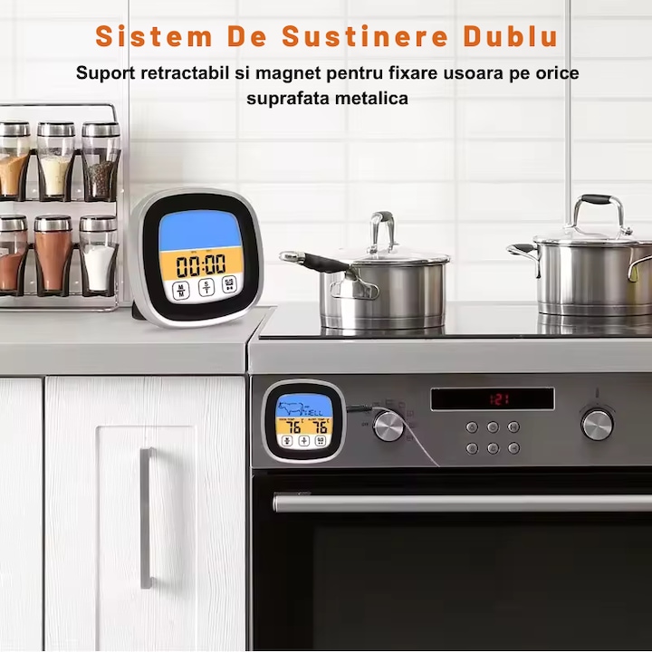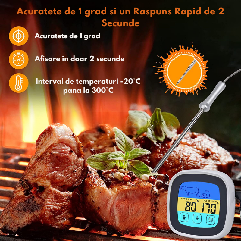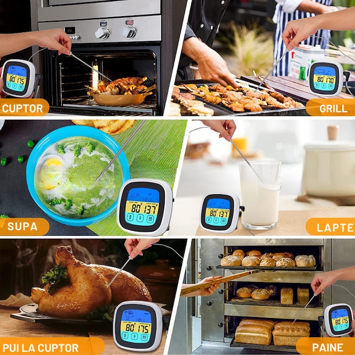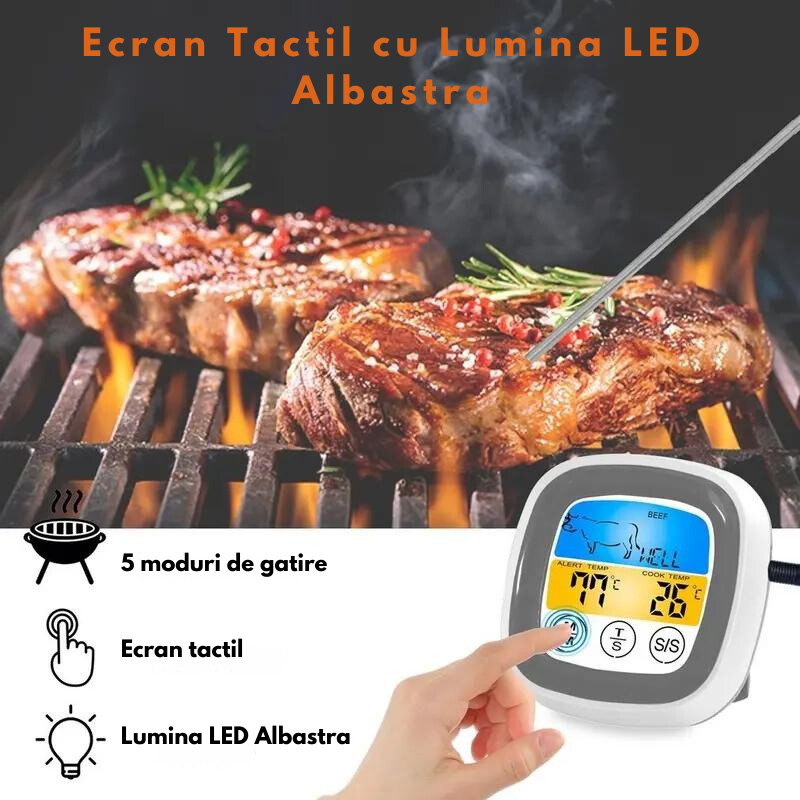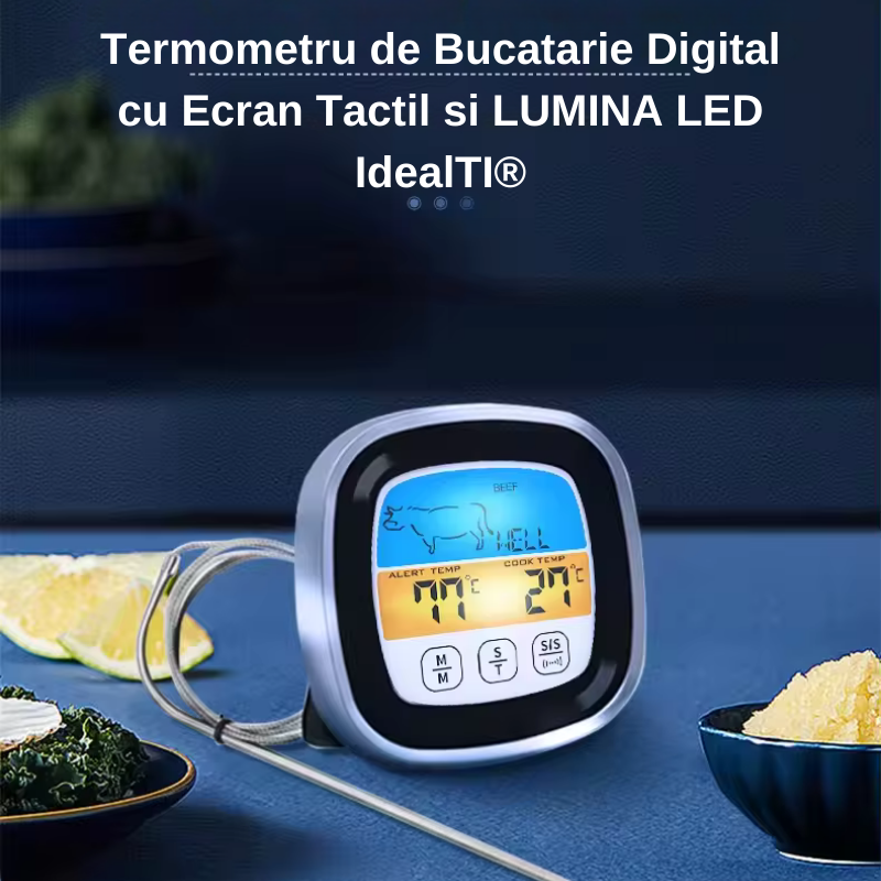 Termometru De Bucatarie Digital IdealTI® Cu Ecran Tactil LED Albastru, Programabil, Moduri de Gatire Multiple, Suport Retractabil si Magnet, Alarma, Rezistent La Umiditate, 2 Tipuri de Masurare,