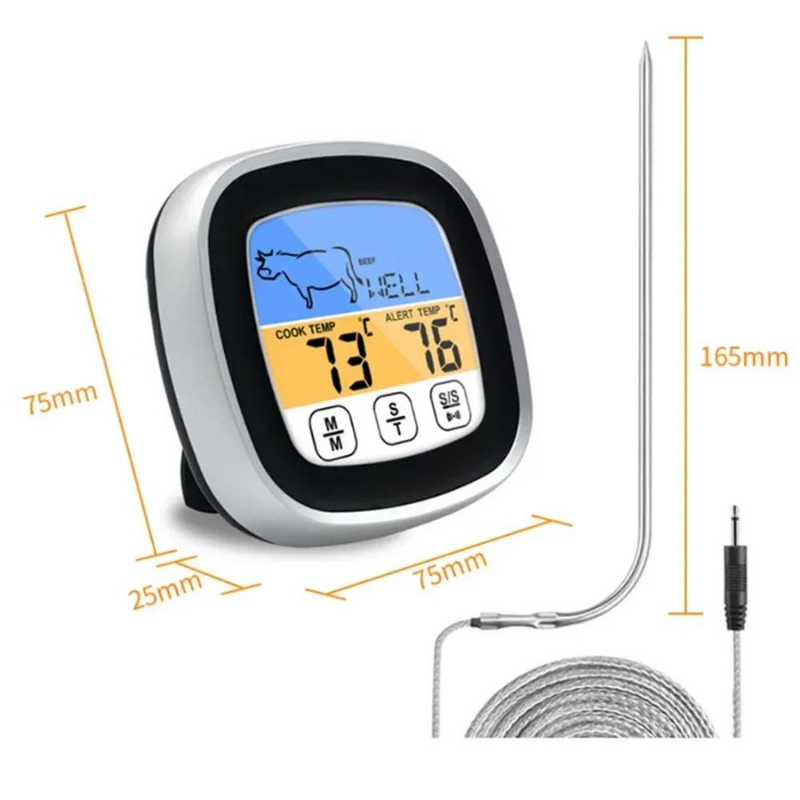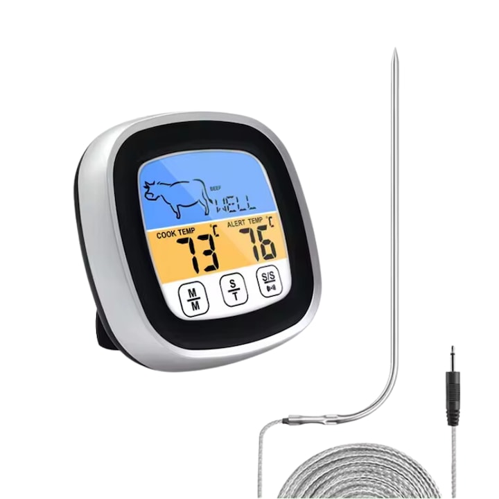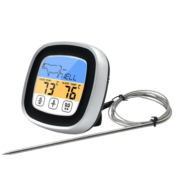 Acest termometru de bucatarie digital este partenerul ideal pentru orice bucatar, fie el amator sau profesionist. Dotat cu un ecran tactil cu lumina LED albastra, termometrul asigura o utilizare simpla si rapida, chiar si in conditii de lumina redusa. Alimentarea cu 2 baterii AAA garanteaza o durata lunga de viata, iar butonul de comutare a temporizatorului te ajuta sa gestionezi perfect timpul de gatit.