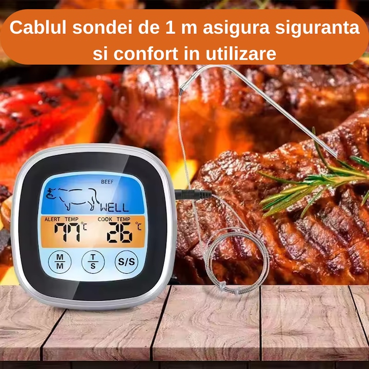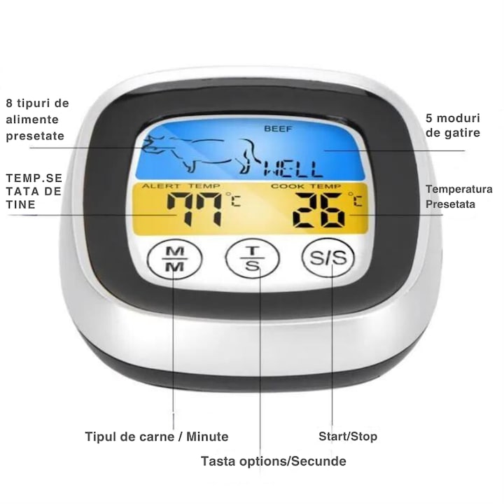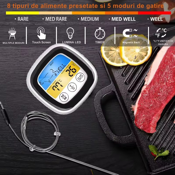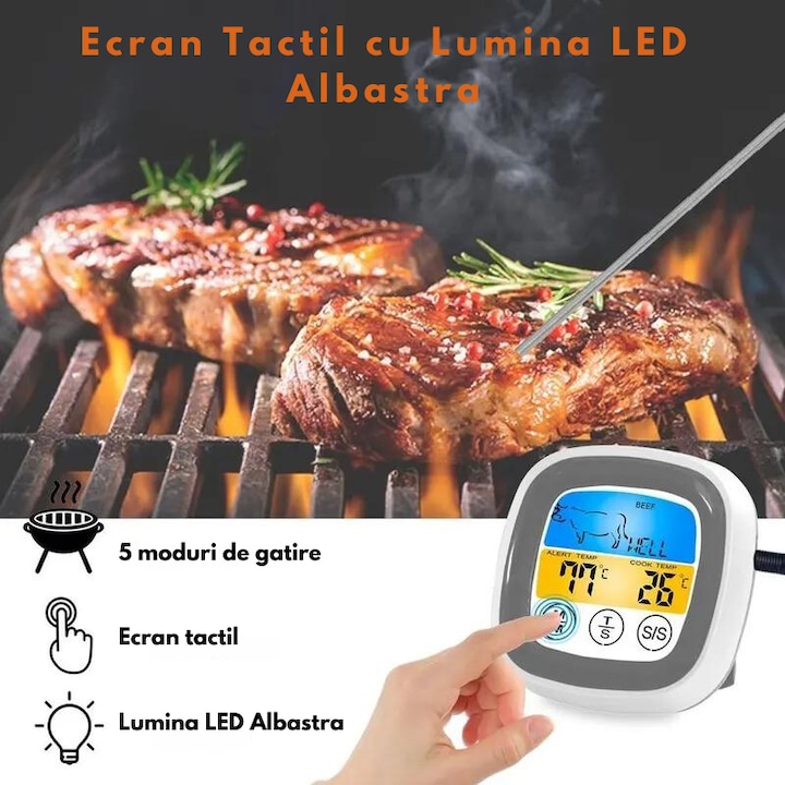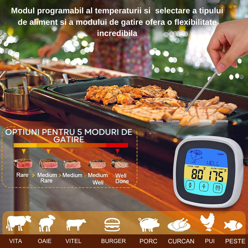- Selectare mod de gatire: Optiuni pentru 5 moduri de gatire: rare, medium rare, medium, medium well, well done.