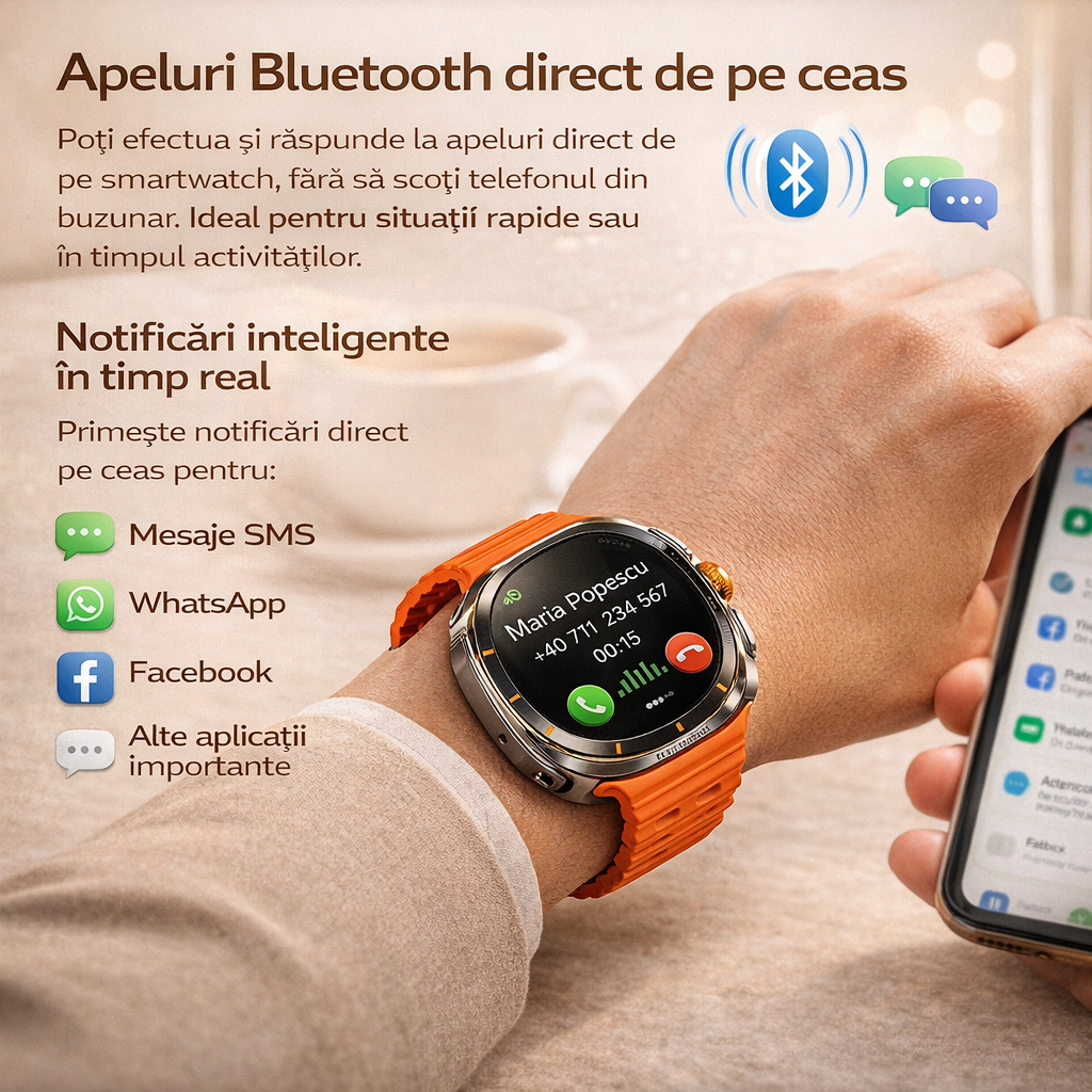 Poti efectua si raspunde la apeluri direct de pe smartwatch, fara sa scoti telefonul din buzunar. Ideal pentru situatii rapide sau in timpul activitatilor.