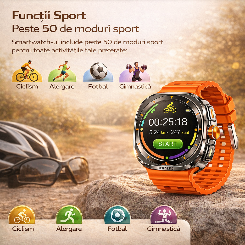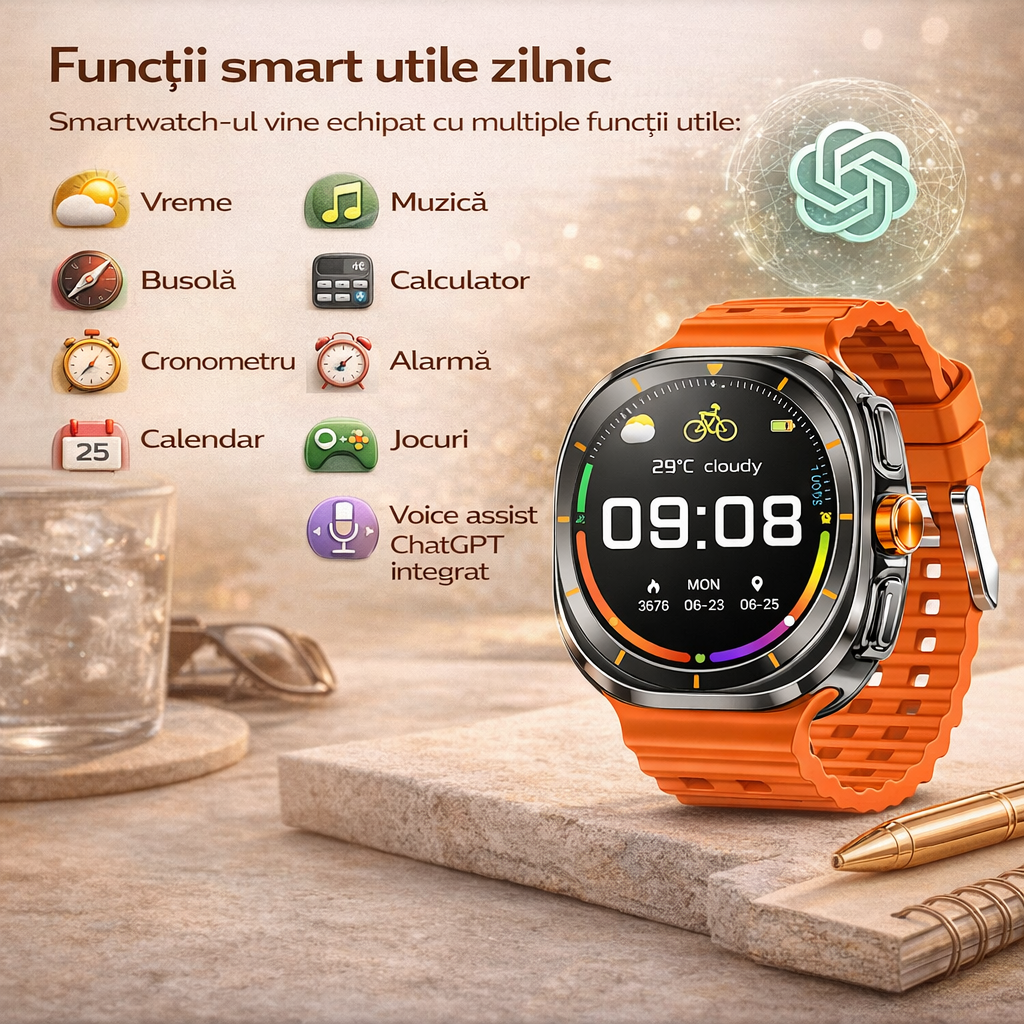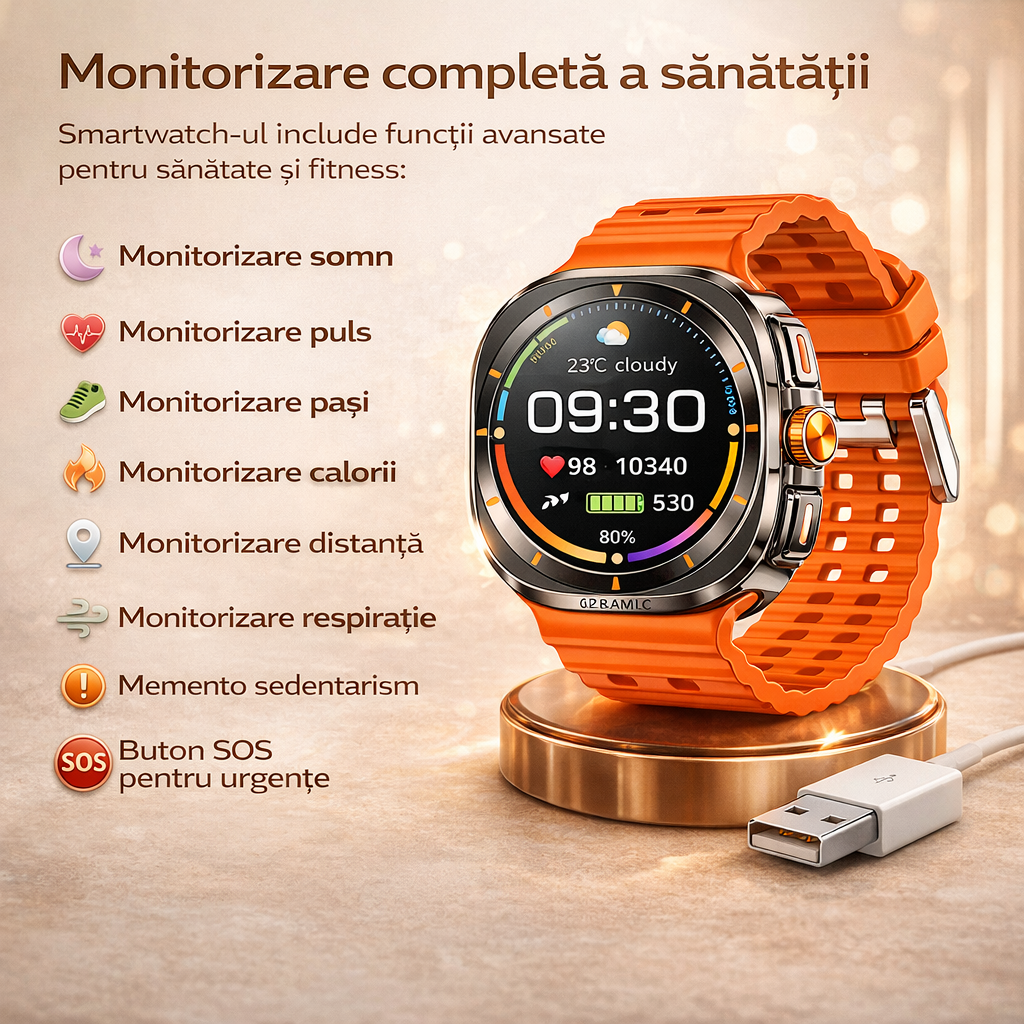 Descopera un smartwatch modern, elegant si puternic, perfect pentru utilizarea zilnica, sport si monitorizarea sanatatii.