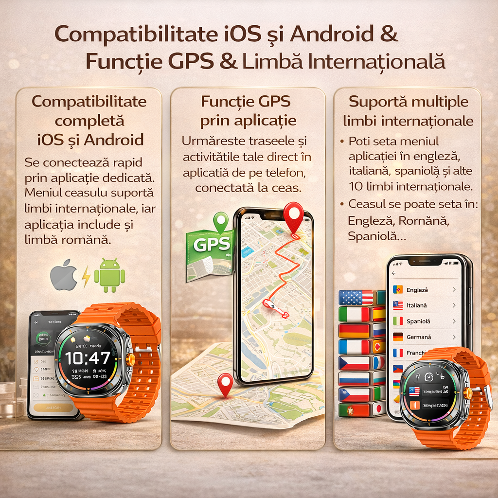 Se conecteaza rapid prin aplicatie dedicata. Meniul ceasului suporta limbi internationale, iar aplicatia include si limba romana.