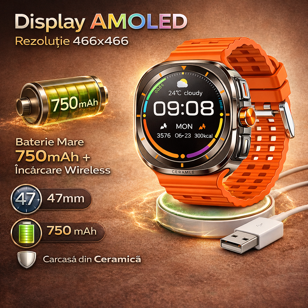 Cu un design robust de 47mm si carcasa din ceramica, acest ceas inteligent imbina performanta cu stilul, fiind ideal pentru orice stil de viata activ.