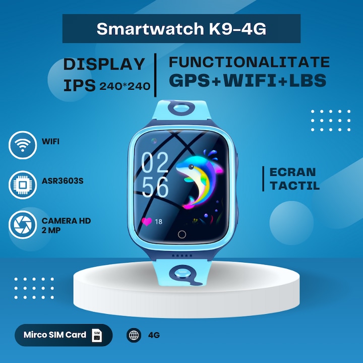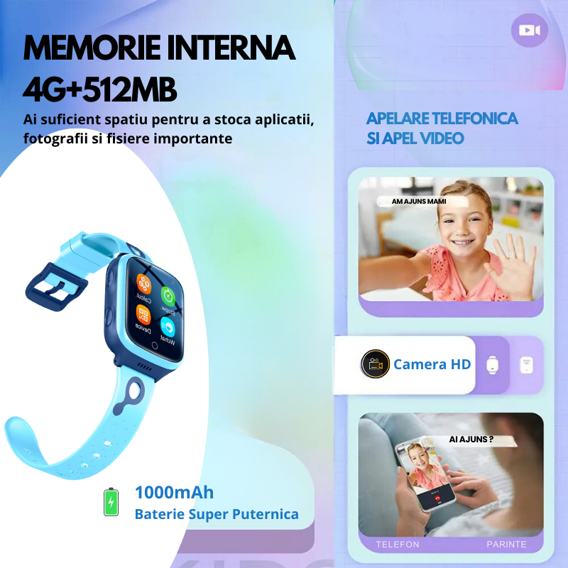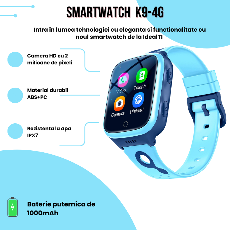 Ceas Smartwatch Pentru Copii K9 IdealTI, 4G, GPS, 1.4 inch, Monitorizare Traseu, Buton SOS, Slot Cartela SIM, Apelare Telefonica, Apel Video, Camera Foto, Blocare Apel, Localizare GPS+LBS, Alarma, Baterie Mare De 1000 mAh