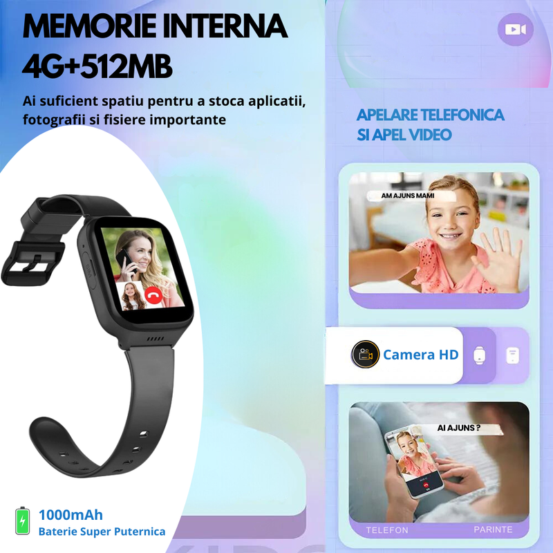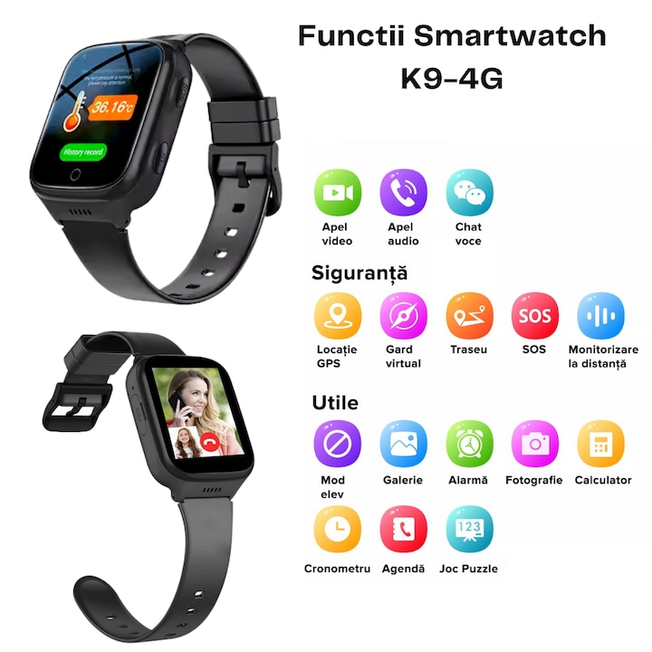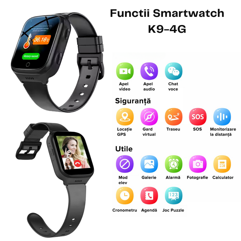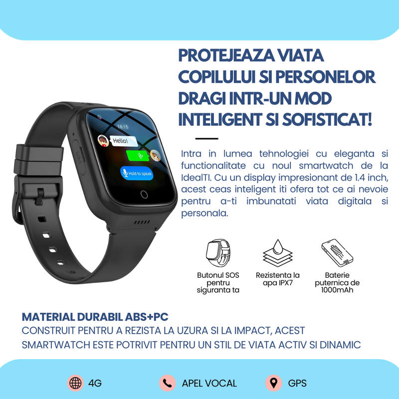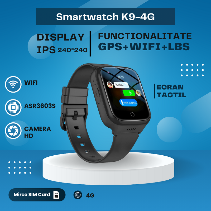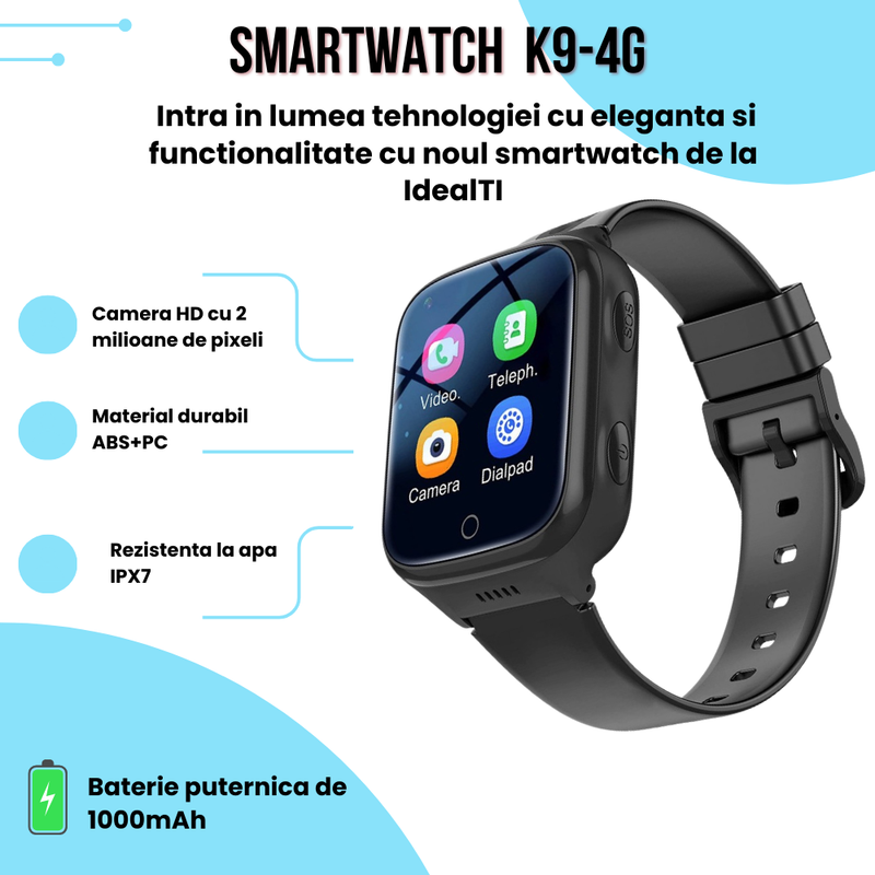 Ceas Smartwatch Pentru Copii K9 IdealTI®, Monitorizare Traseu GPS, 1.4 inch, Buton SOS, Slot Cartela SIM, 4G, Apelare Telefonica, Apel Video, Camera Foto, Blocare Apel, Localizare +LBS, WIFI, Alarma, Baterie De 1000 mAh, Negru