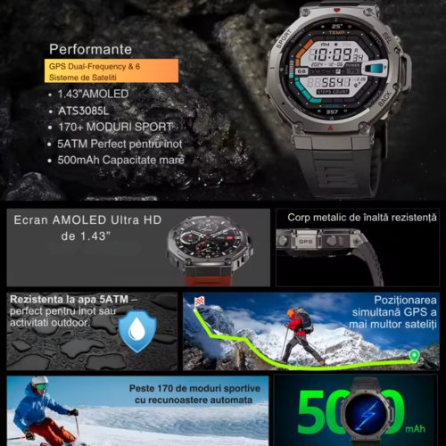 Cu un display impresionant de 1.4 inch, acest ceas inteligent iti ofera tot ce ai nevoie pentru a-ti imbunatati viata digitala si personala.