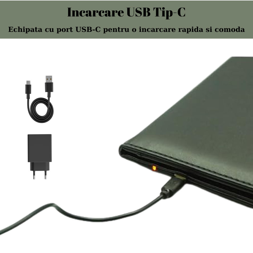 - Incarcare USB Tip-C: Echipata cu port USB-C pentru o incarcare rapida si comoda. Specificatii incarcator: Input AC 100-240V 50/60 Hz; Output DC 5V.
