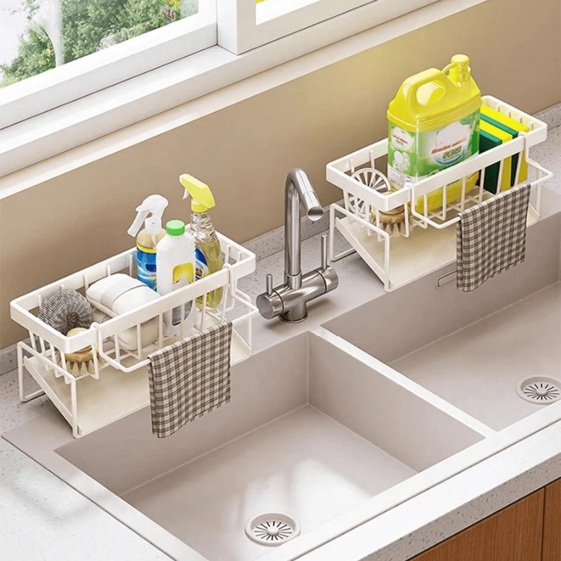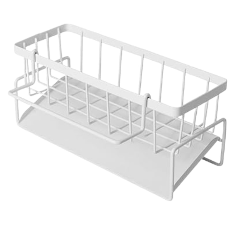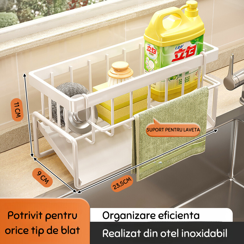 Suport pentru burete, lavete si detergent vase din otel inoxidabil IdealTI®, multifunctional, organizator accesorii de curatenie, tava de scurgere , incapator, alb